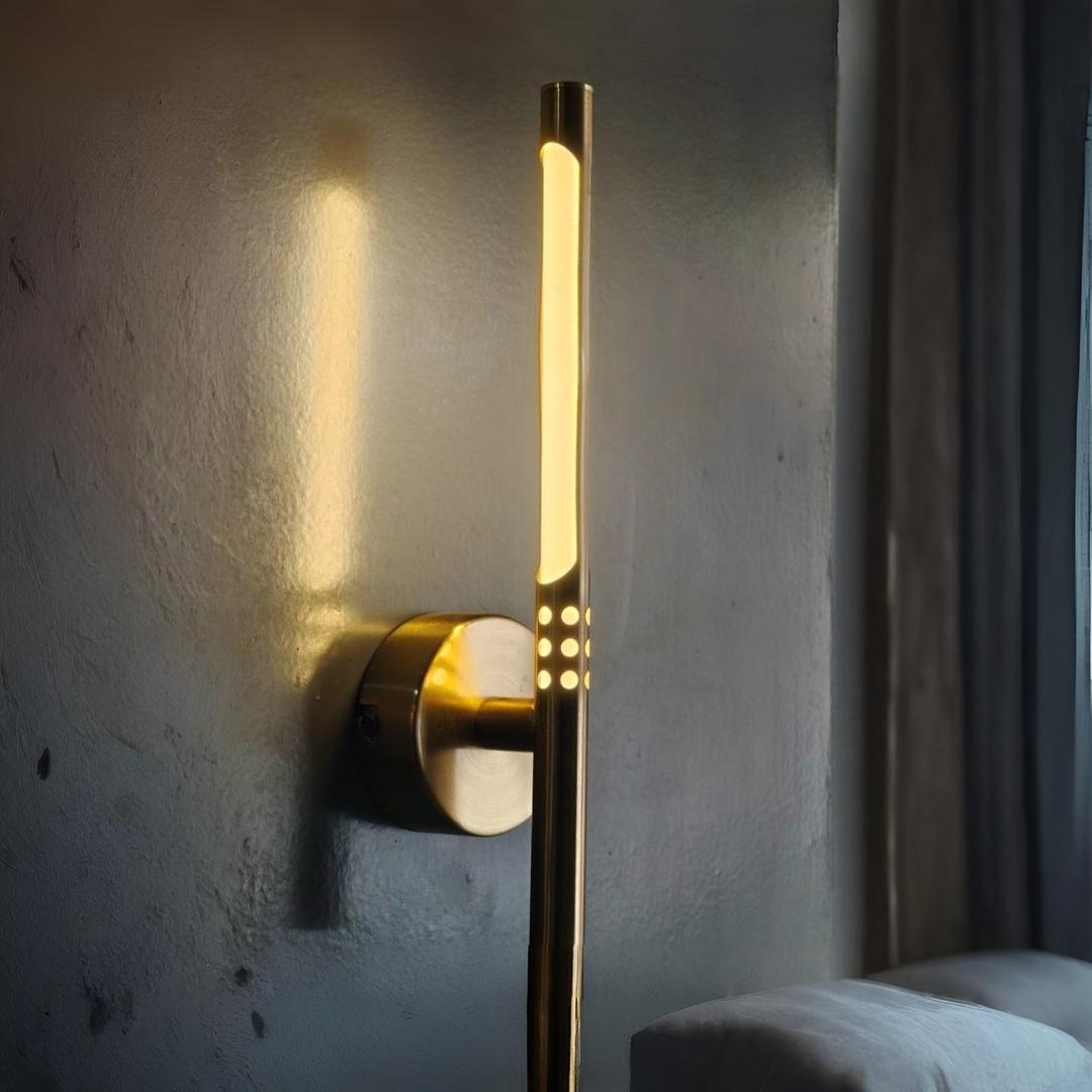 Transform your interior spaces with our Modern Linear LED Wall Sconce—a masterpiece of contemporary lighting design. This sophisticated fixture features a distinctive vertical light bar framed by gleaming gold brass tubes, with thoughtful decorative dot perforations that cast enchanting accent patterns. It’s lighting that makes a statement, combining architectural presence with warm, inviting illumination.